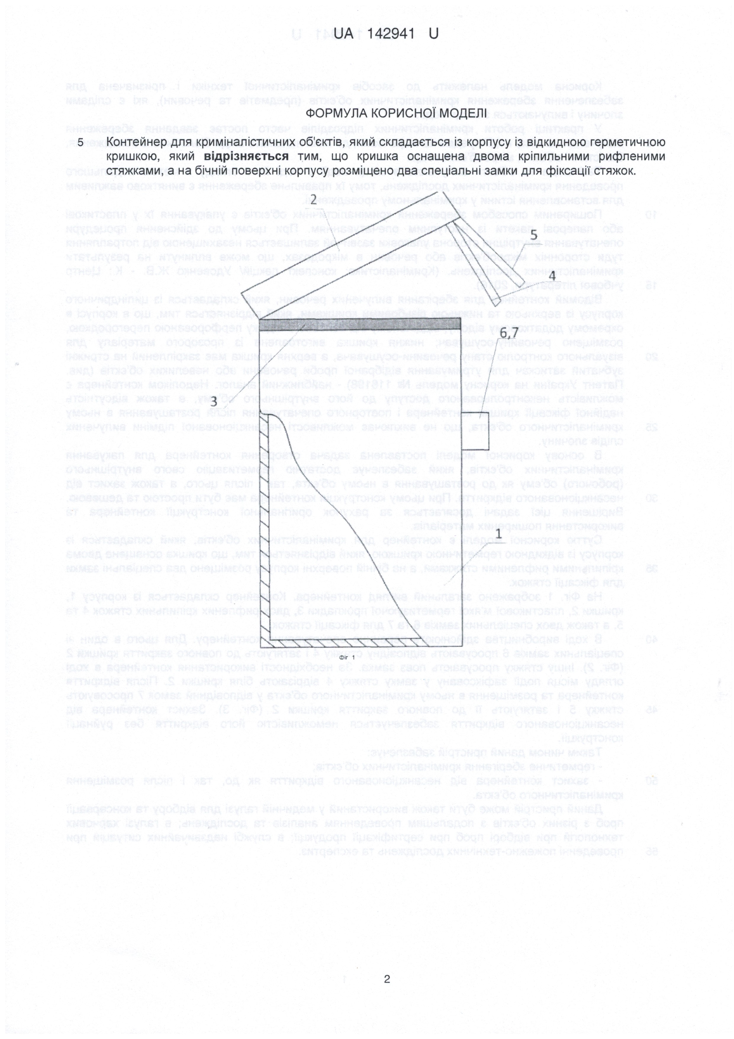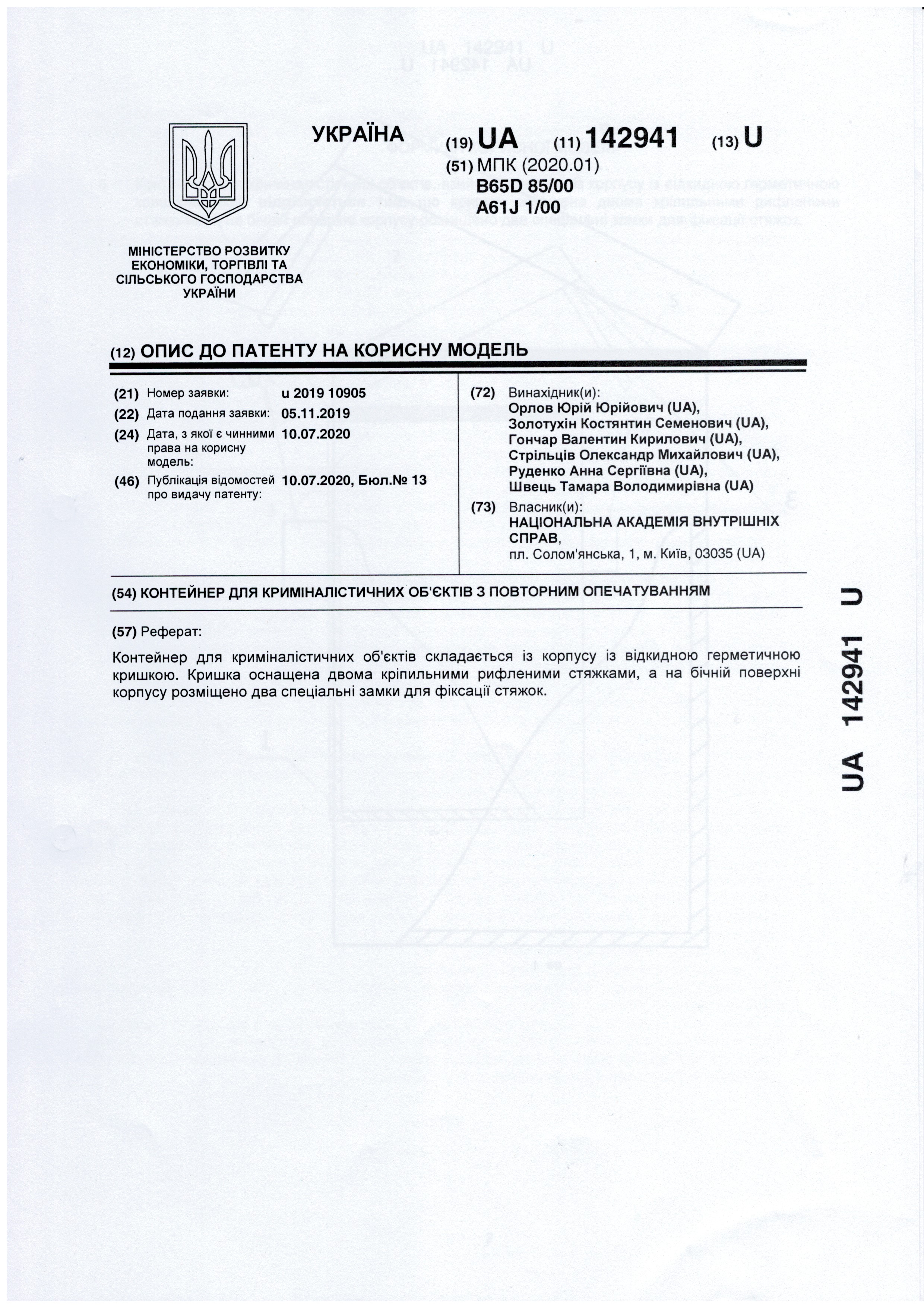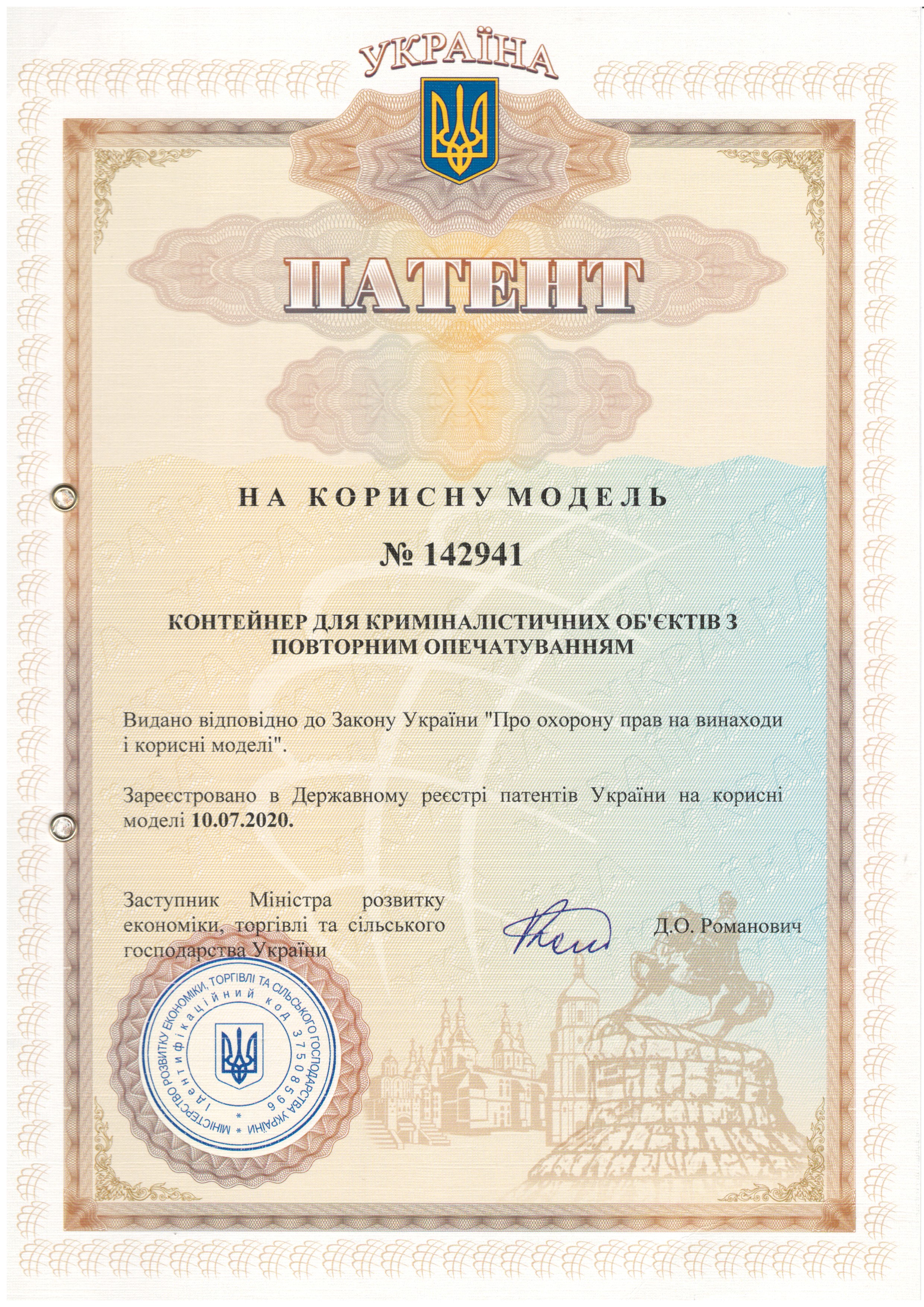 Патент України на корисну модель "Контейнер для криміналістичних об’єктів з повторним опечатуванням"