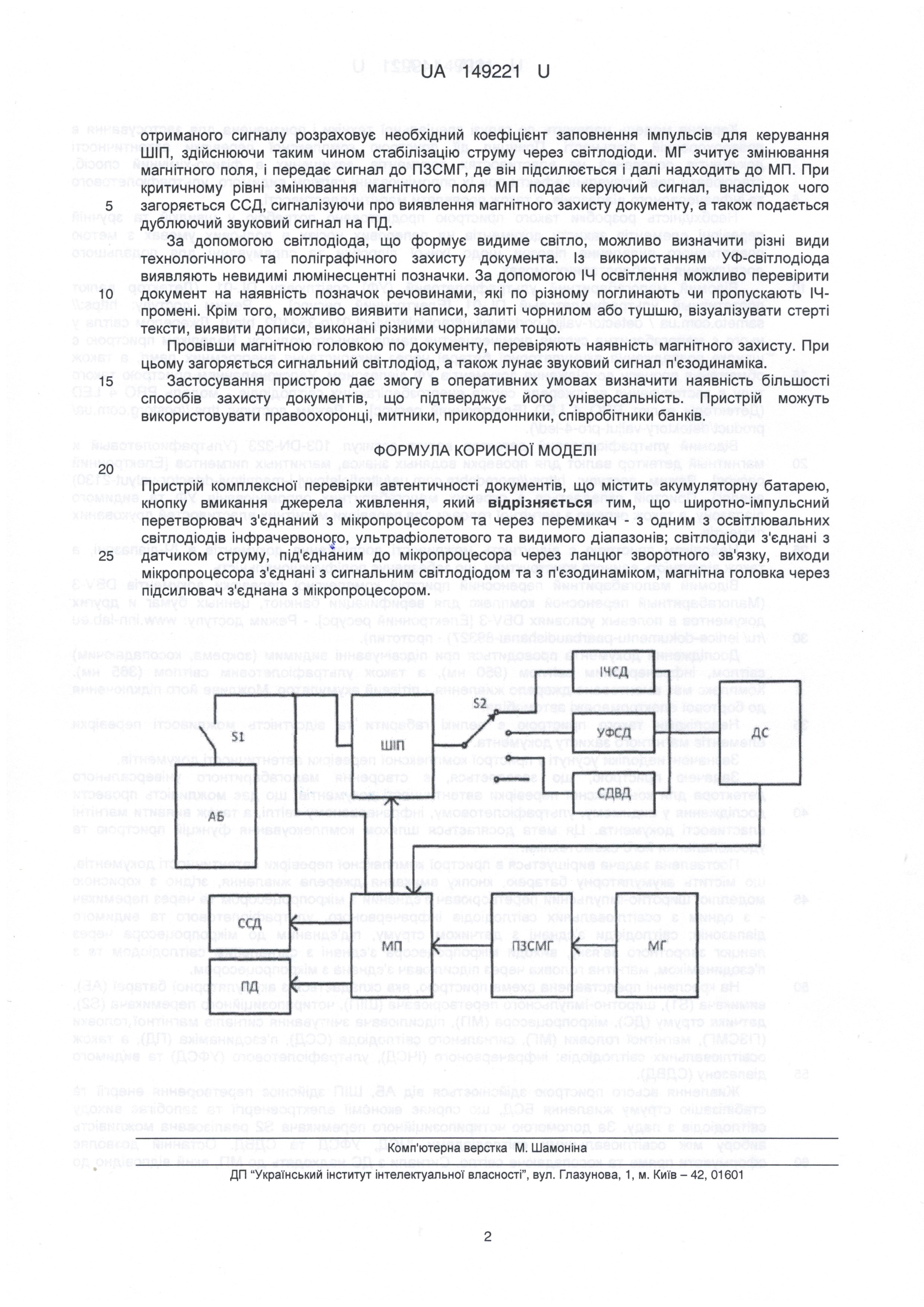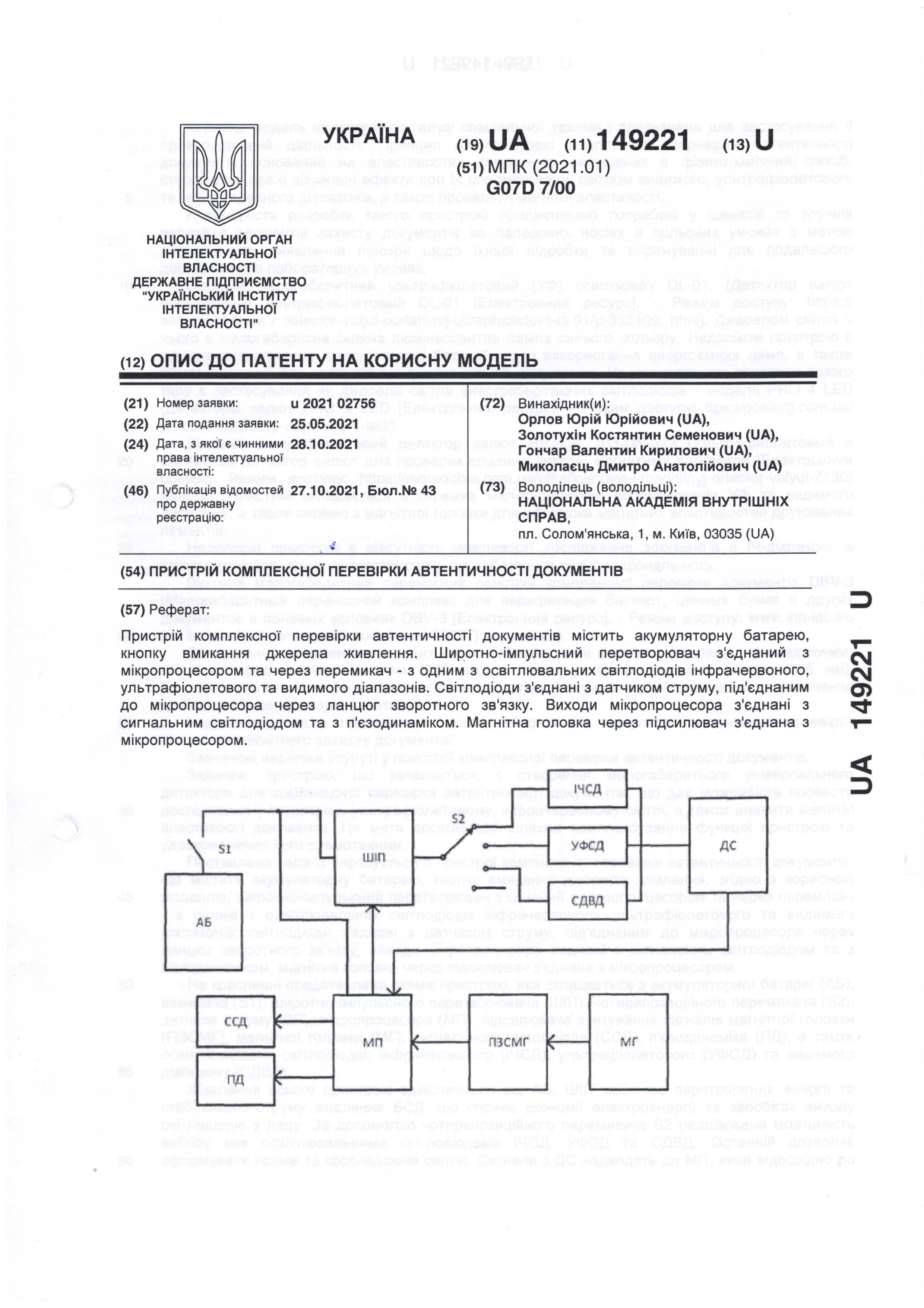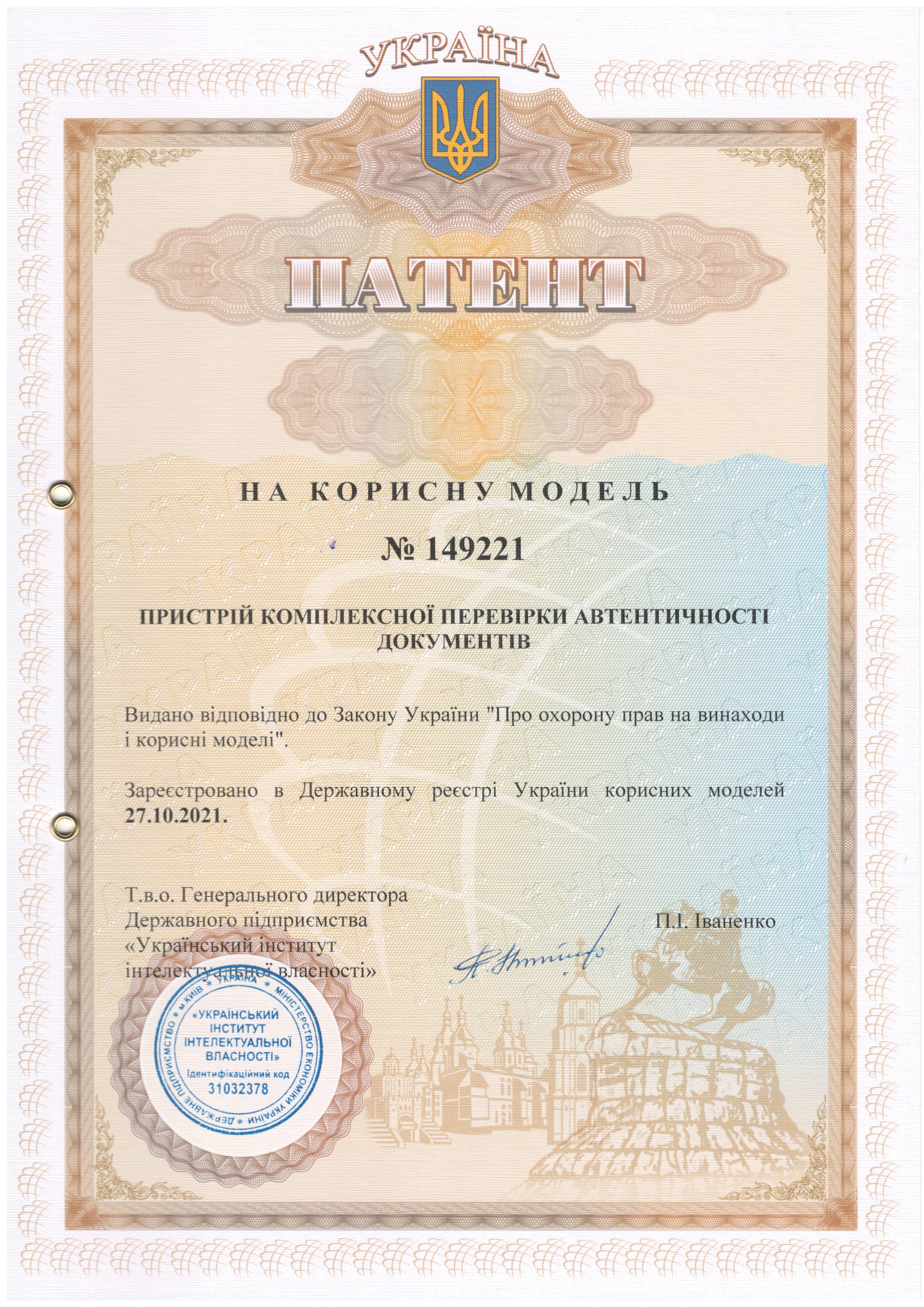 Патент України на корисну модель № 149221 Пристрій комплексної перевірки автентичності документів