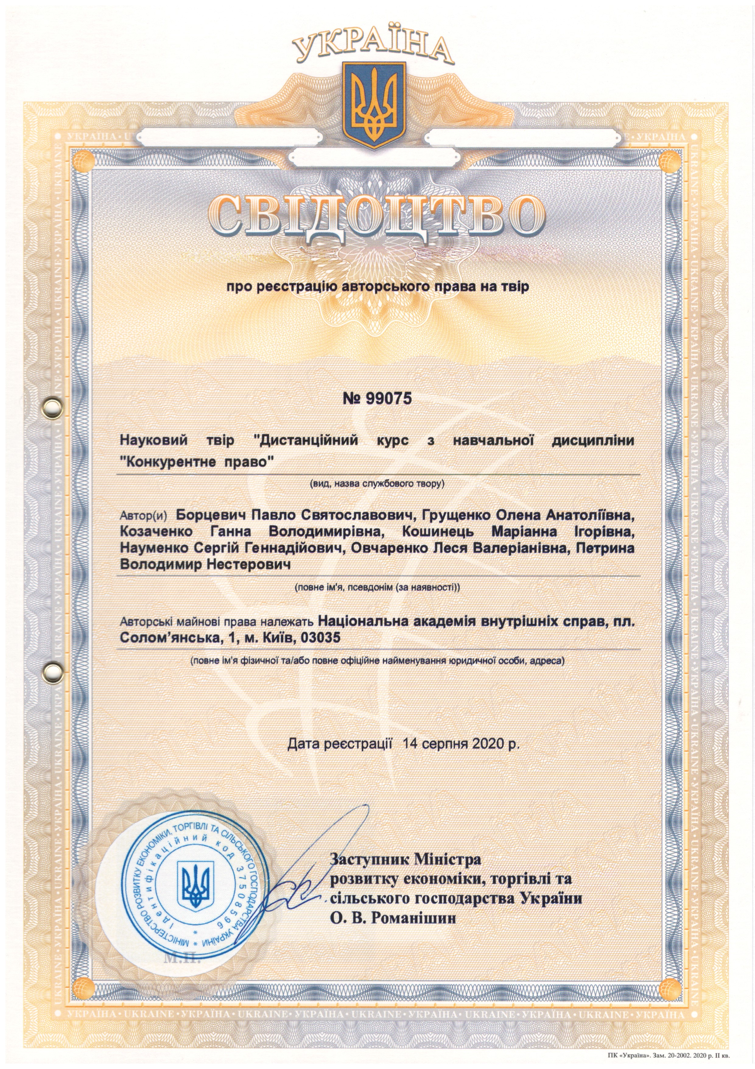 Наукови твір «Дистанційний курс з навчальної дисципліни «Конкурентне право»