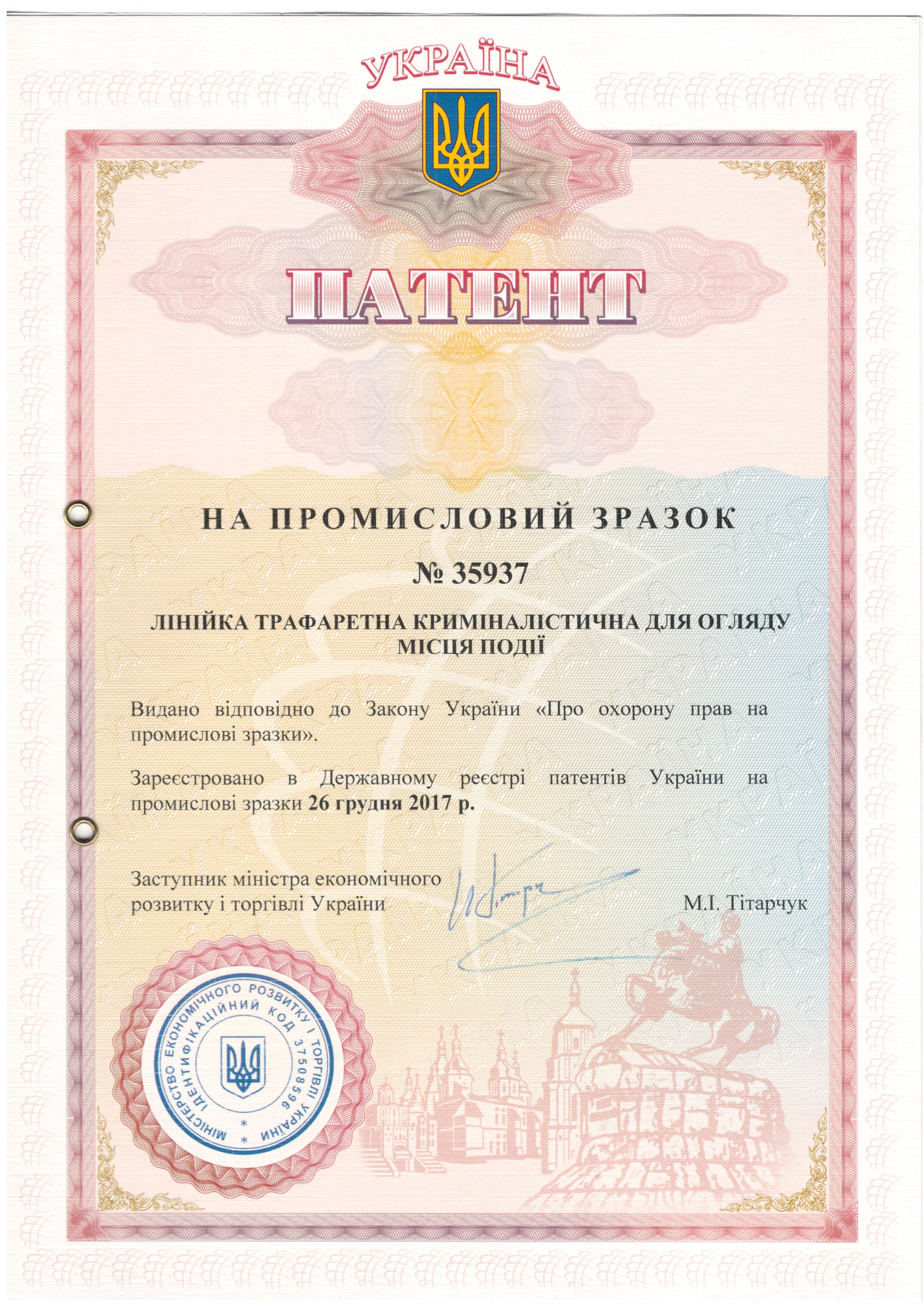 Патент на промисловий зразок "Лінійка трафаретна криміналістична для огляду місця події" № 35937
