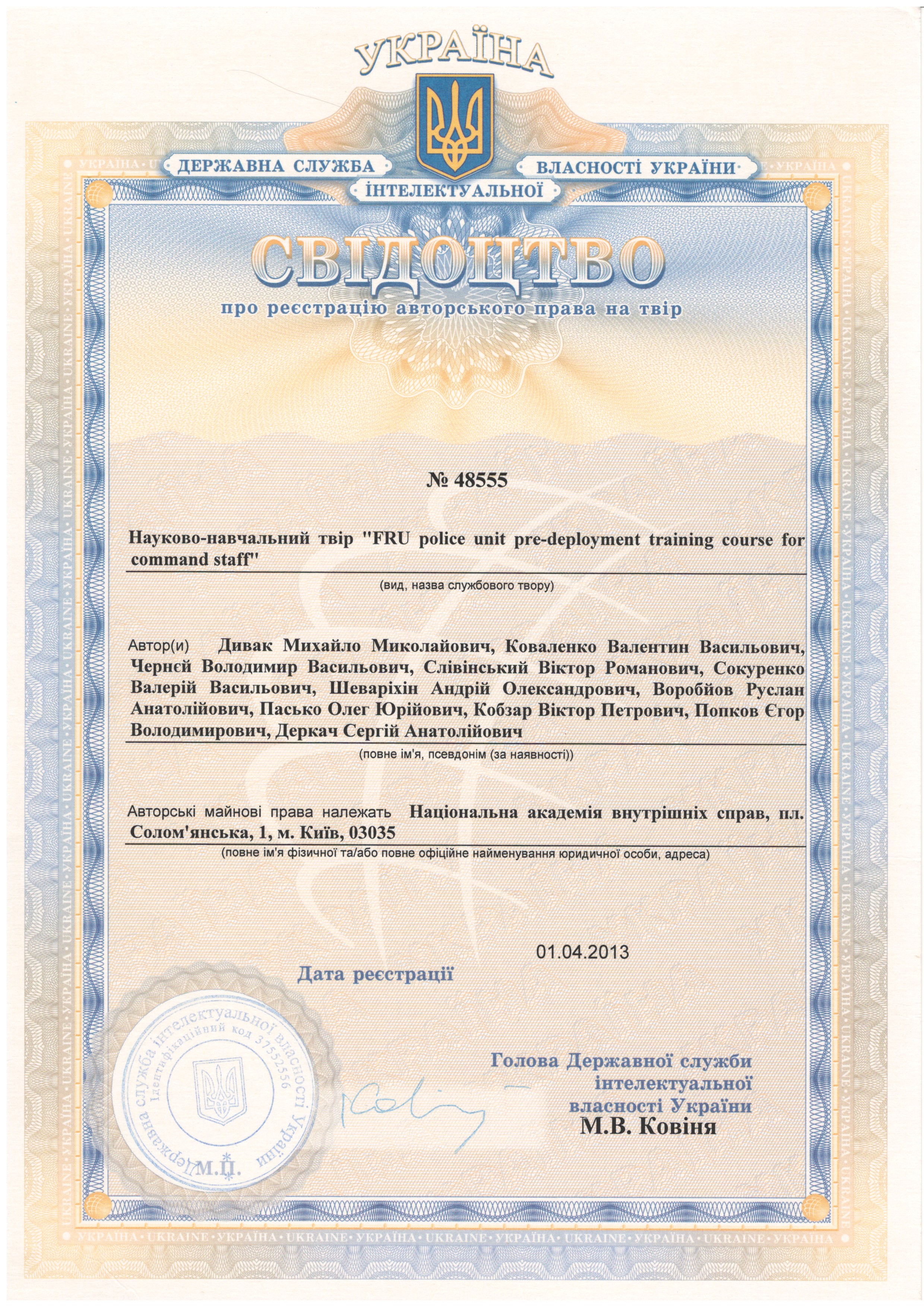 Науково-навчальний твір «UN Police pre-deployment trening course for command staff», Свідоцтво № 48555