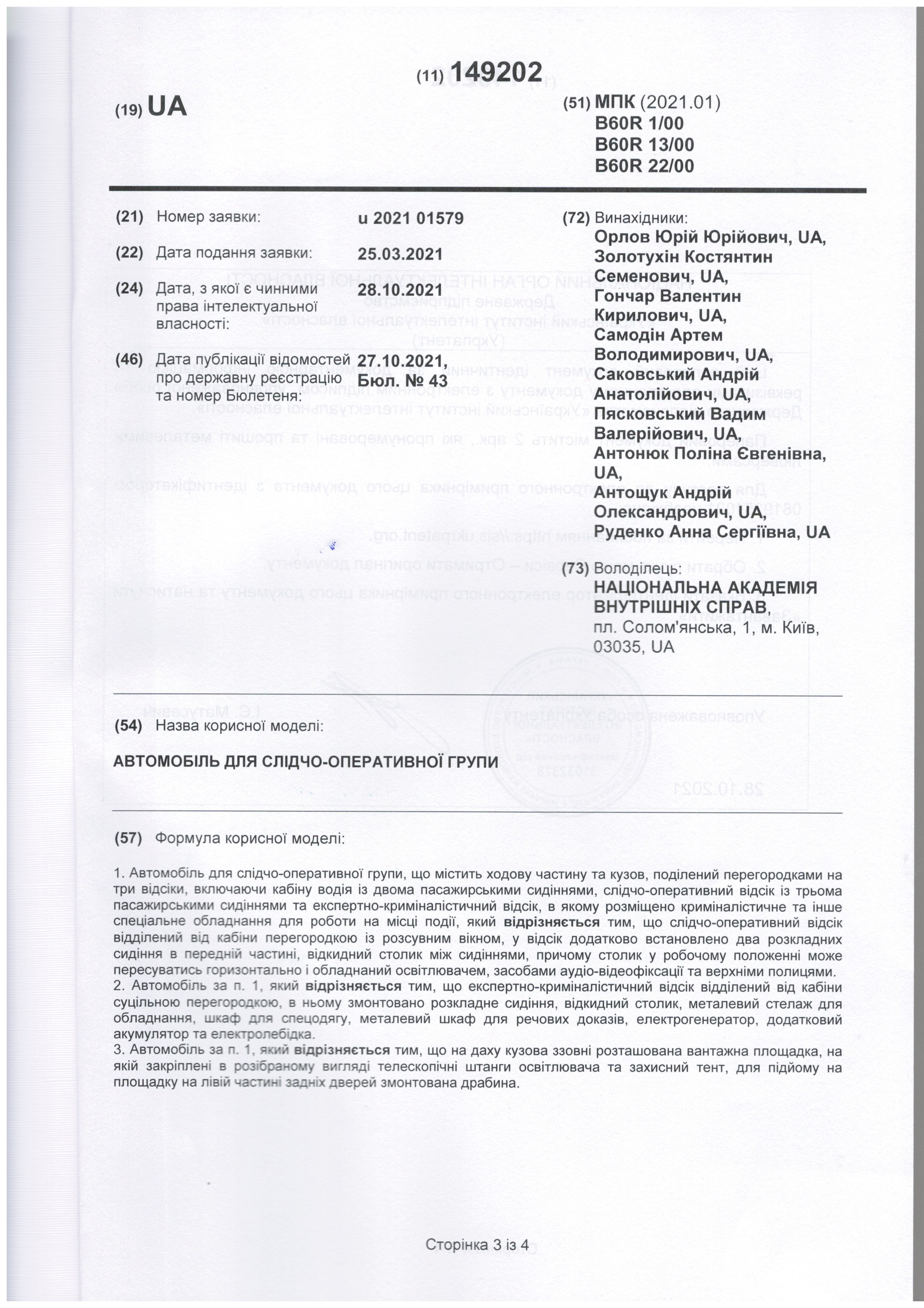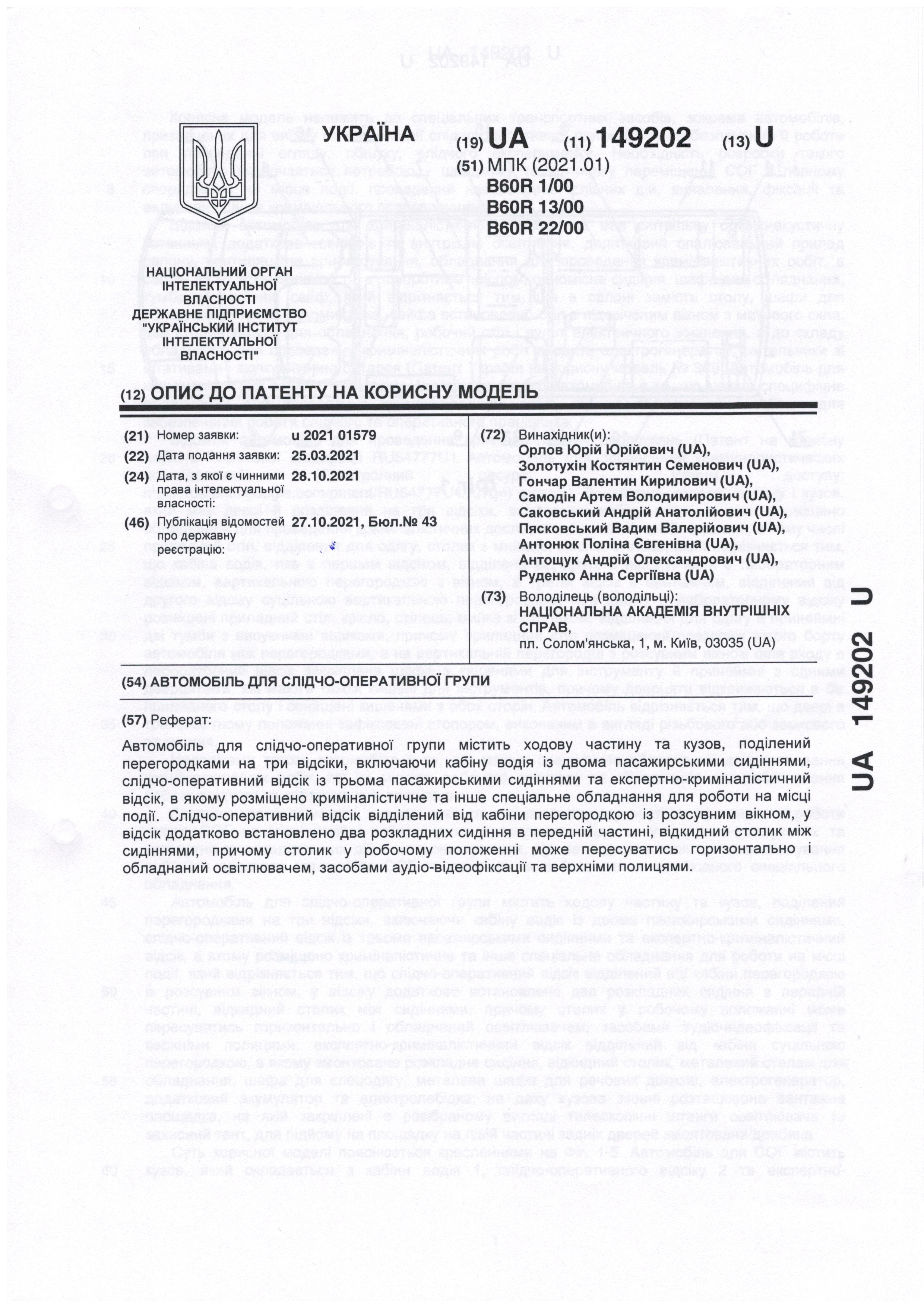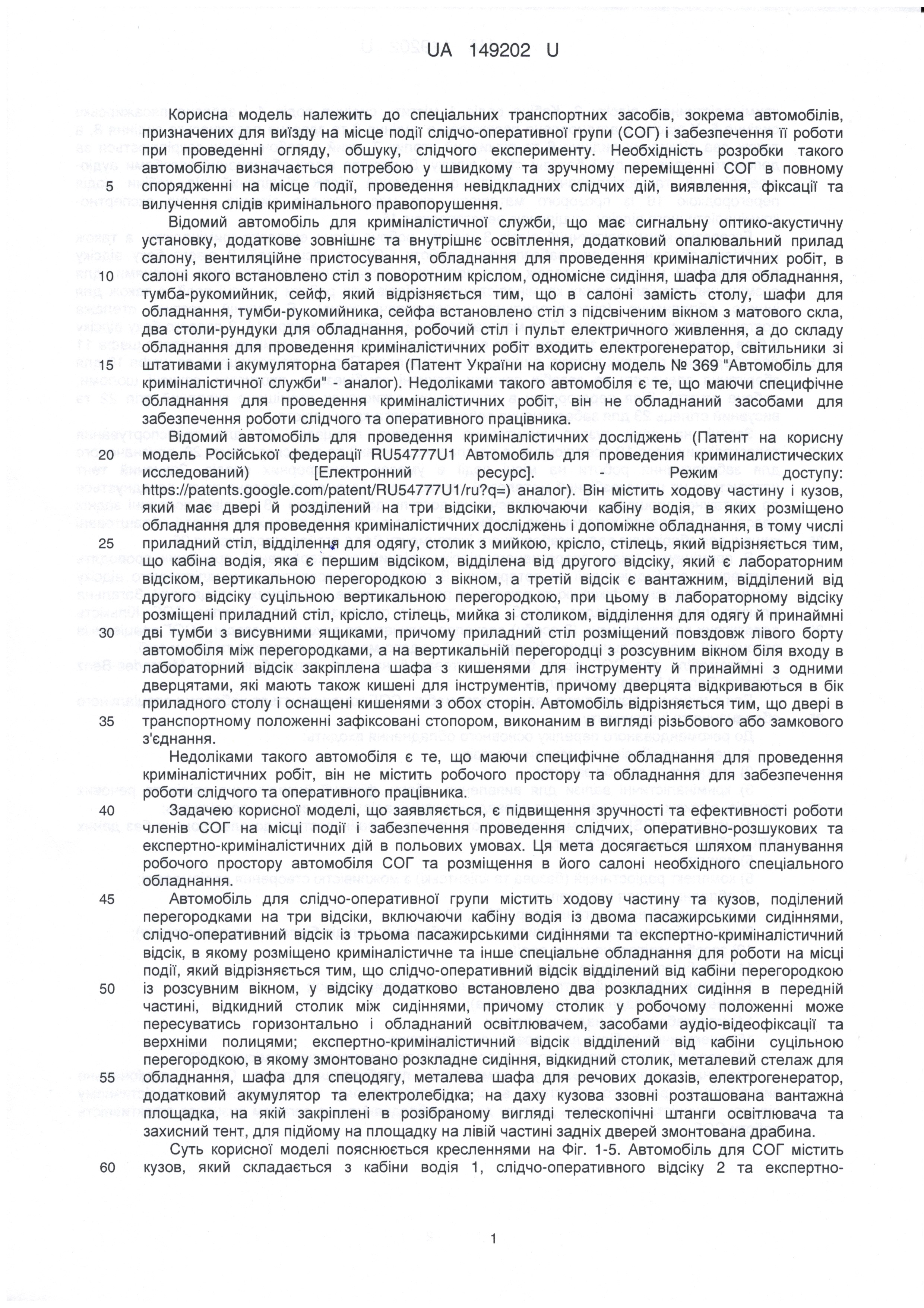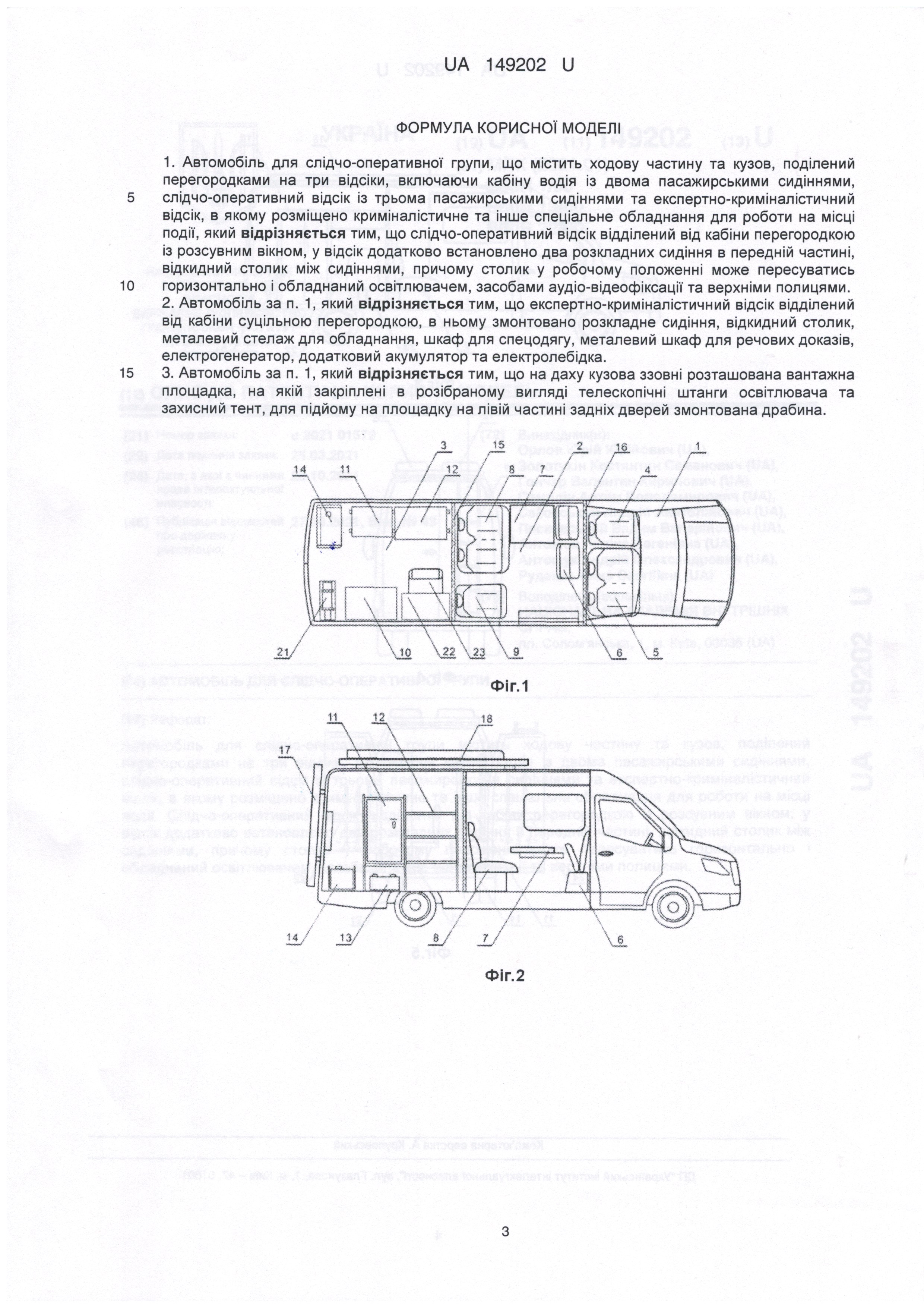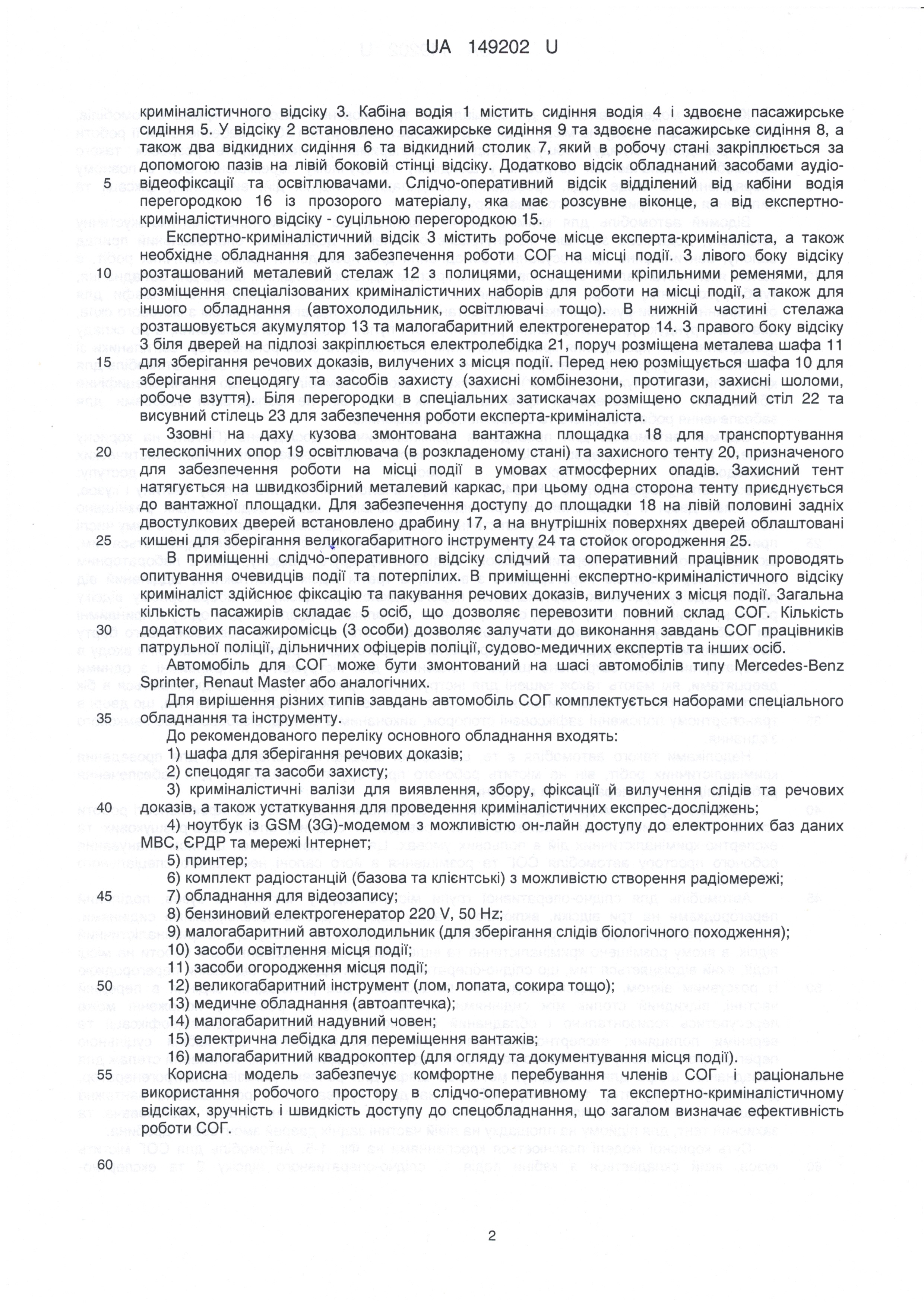 Патент України на корисну модель № 149202 Автомобіль для слідчо-оперативної групи