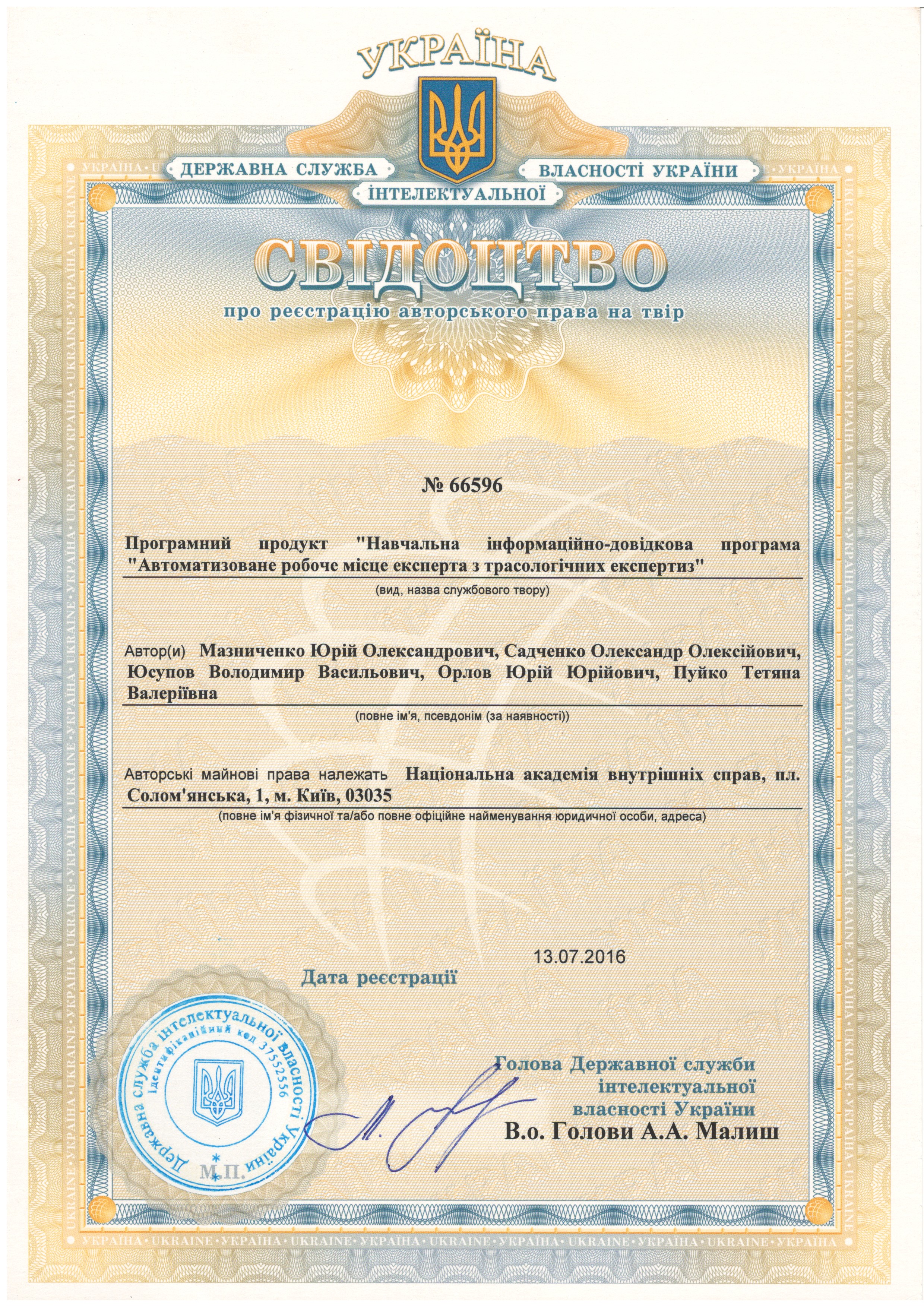 Програмний продукт «Навчальна інформаційно-довідкова програма «Автоматизоване робоче місце експерта з трасологічних експертиз», Свідоцтво № 66596