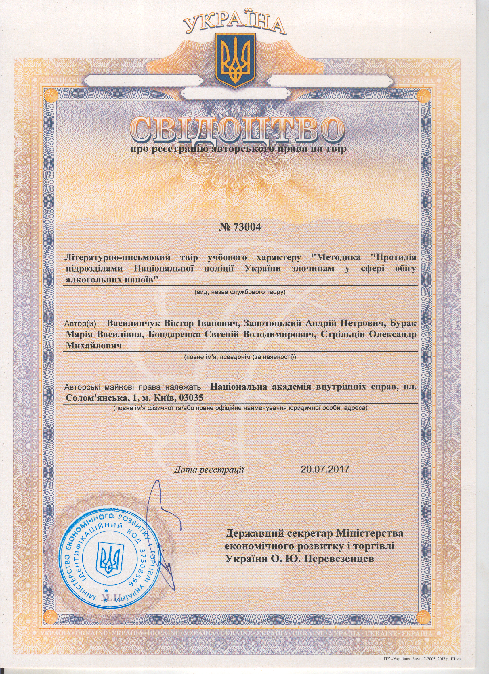 Літературно-письмовий твір учбового характеру "Методика "Протидія підрозділами Національної поліції України злочинам у сфері обігу алкогольних напоїв" №73004