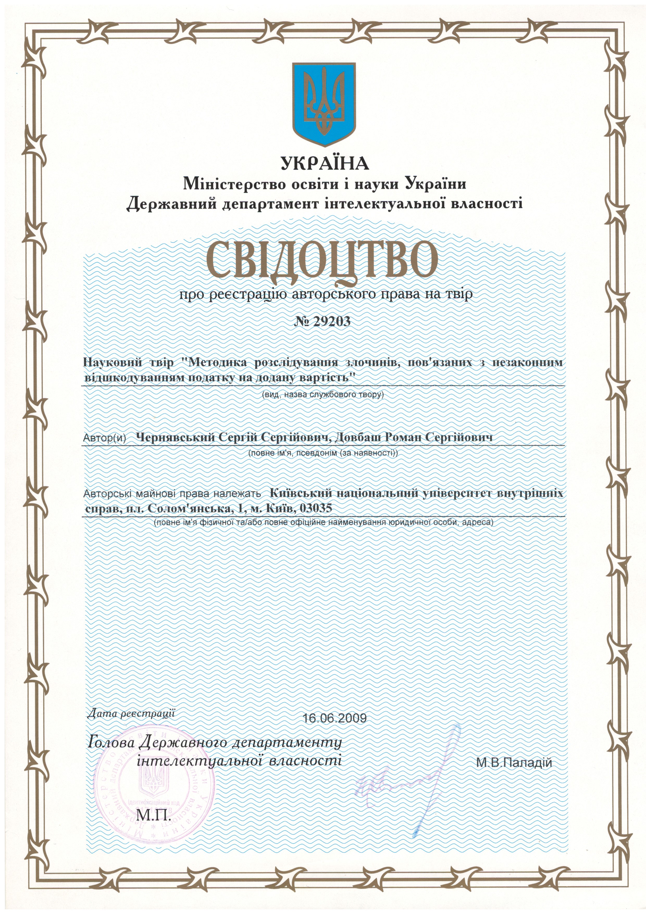 Науковий твір «Методика розслідування злочинів, пов’язаних з незаконним використанням податку на додану вартість», Свідоцтво № 29203